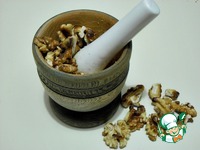 Грецкие орехи обжарить на сухой сковороде, очистить от шелухи. Истолочь в ступке, но не в муку, а в крупку. |