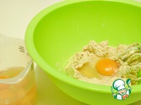 В масляно-сахарную смесь вливать по одному яйца, взбивая на малой скорости миксера. |