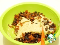 Размешать соду с мандариновым соком, влить в смесь, всыпать просеянную муку. Соединить в однородную массу. Добавить все сухофрукты и быстро соединить, перемешивая снизу вверх лопаткой. |