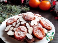 Обсыпать миндальными лепестками или молотыми орехами, выложить дольки кураги, припудрить сахарной пудрой. |