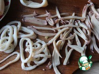 Описание: Этот рецепт я записывала очень давно, когда кальмаров можно было найти только в банках и крайне редко, если повезет. И вот, сейчас, когда идут предновогодние приготовления, захотелось чего-то иного, помимо Оливье. Решила заглянуть в свои старые "кладовые", нашла этот рецепт и, спустя много лет, приготовила салат, который, наверняка, был переписан из какого-то журнала тех времен, типа "Работница" или "Крестьянка". А салат, скажу я вам, очень вкусный! Достойный праздничного стола. Мы всей семьей решили, что он, вполне, заменит и Оливье, и Крабовый. Если и вы ищите вкусовых перемен, то попробуйте этот вариант. Приводимое количество продуктов ориентировочное. Готовлю все по вкусу, да и размеры заготовок у всех разные.