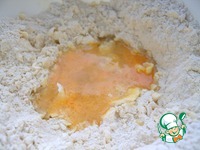 Взбить слегка яйца с растительным маслом без запаха (я ещё добавила щепотку мелкой соли) и влить в муку. |