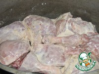 Окорочка порубить небольшими кусочками(я кожу не люблю, убираю), натереть перцем, солью, приправой для птицы и обмазать сметаной(2-3 ст л).Положить в толстостенную посуду, смазанную жиром. |