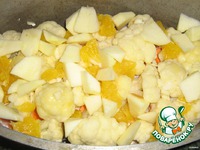 апельсин (очищенный от пленок и мелко "поломанный"), очищенное и порезанное яблоко, дольки лимона, порезанные со шкуркой,посолить немного. |