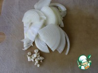 Лук чистим, режем полукольцами или полосками, мелко-рубим чеснок. Кладём лук и чеснок на горячую сковороду с растительным маслом, обжариваем до прозрачности лука на среднем огне. |