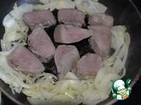 Язык режем ломтиками. Раздвигаем в стороны лук с чесноком, кладём язык. Обжариваем с обеих сторон до лёгкой корочки. |