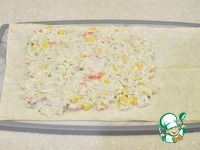 И лаваша вырежьте ровный прямоугольник. На 2/3 лаваша выложите готовый салат. |