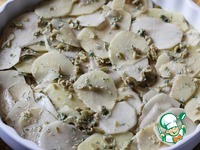 Спустя это время вынуть форму из духовку, температуру увеличить до 230°. Равномерно полить картофель сливками, вернуть форму в духовку и запекать еще минут 15, до полной готовности картофеля. |