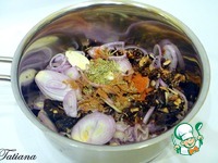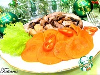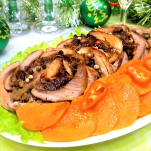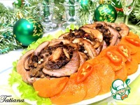 На мясо выложите начинку, отступив от краёв по 2 см. |