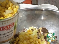 В миске соединить мясо, картофель, огурец, яйцо, соль и открыть банку с кукурузой |