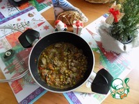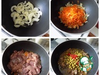 Я взяла высокий сотейник, налила в него масла оливкового, разогрела и выложила лук репчатый, порезанный полу-кольцами. Лук порежьте так, как нравится! Золотим лук и выкладываем натёртую морковь. Я потомлю морковь с луком минут 5 на маленьком огне при закрытой крышке. Выкладываем печень, перемешиваем. Тушим минут 10 опять же на минимальном огне при закрытой крышке. Печень птицы, она, очень быстро приготовится. Добавляем пол-банки зелёного горошка без жидкости. Отрезала от целого перца чили примерно 5 см, убрала семена и нарезала тонко. Добавила в содержимое сотейника. Если перца в стручке нет, то по желанию поперчите любым, вами любимым. Если будут есть дети, то перец не кладите. Солим по вкусу и всё перемешиваем. Тушим ещё на минимальном огне под крышкой минут 5. |
