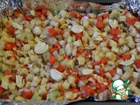 Выложить их в форму для запекания. Посолить, поперчить, полить оливковым маслом и перемешать. |