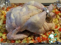 Кожу на грудке и голенях аккуратно отделить. Влить оставшуюся сырно-масляную смесь под кожу и "помассировать" для распределения смеси. Связать ножки. Выложить грудкой вверх на смесь овощей. |