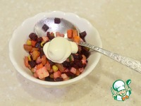 Заправьте винегрет майонезом. В классическом варианте заправкой служит масло, но мы заменим его на майонез, т. к он позволит скрепить овощи, чтобы они были более однородными и держали форму. |