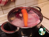 1. Для начала отварим свиные ребра. Солим воду и добавляем туда рёбра, морковь, лук, имбирь, лавровый лист и душистый перец. Варим примерно 40 мин. |