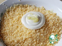 Измельченный сыр выложить в миску, добавить к нему майонез и чеснок. Чеснока должно быть немного, чтобы он лишь слегка чувствовался и давал пикантность, а не остроту. |