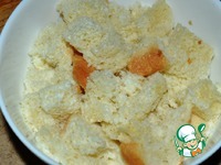 Батон режем на кусочки и замачиваем в теплом молоке. |