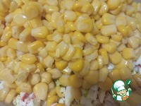 Смешала рис, яйца, крабовые палочки, лук порей, кукурузу. Заправила майонезом. |