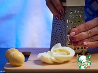 На той же терке натрите сначала сыр, выложите его на белки, а потом положите желток, растертый на мелкой терке. |