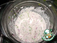 Готовим соус: в блендере измельяаем зелень, чеснок и редис. Добавляем сметану, соль по вкусу. |