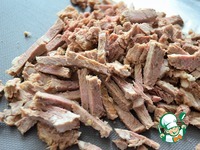Говядину нарезать мелким бруском, добавить к картофелю. |
