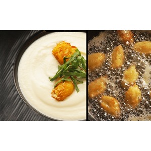 Описание: Суп-пюре из цветной капусты с заварными пончиками из голубого сыра. Сочетание просто божественное.