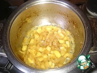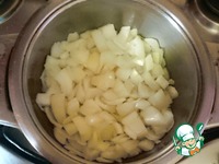 Займёмся луком для рагу. Придётся немного повозиться. В кастрюлю, где будет готовиться рагу, наливаем немного растительного масла, кладём лук, который нарезали крупно и обжариваем его. |