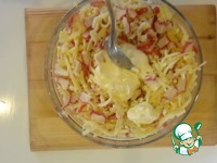 Добавляем ко всем ингредиентам майонез и перемешиваем. |