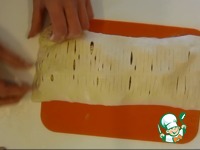 Раскатываем тесто. На одну половину накладываем начинку, на другой половине делаем надрезы. |
