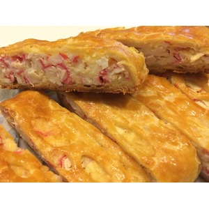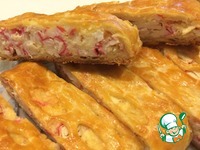 Описание: Отличная закуска на скорую руку. Слоеное тесто, крабовые палочки, сыр и яйца, гармонично сочетаются в этом пироге.