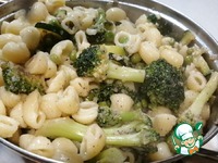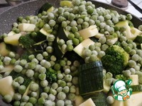 Добавить в сковороду с анчоусами брокколи, цукини и зелёный горошек. Обжаривать, помешивая, до мягкости овощей, около 7 минут. Поперчить и если не хватает соли то досолить. |