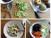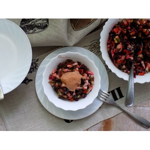 Описание: Повторюсь! Для меня все салаты, которые делаются со отварной свёклой, морковью и картофелем, называются винегретами. Вы можете назвать по-своему. Предлагаю вам попробовать вкусный и полезный винегрет с морской капустой, которую я возьму вместо квашенной. Огурец будет у меня свежий и я добавлю яблочко. Заправлю винегрет нерафинированным подсолнечным маслом с чесноком и перцем кайен. Для подачи я добавлю ложечку икры тресковой. Икру можно взять любую и красную в том числе. Или вовсе не класть, а положить кусочек селёдки.