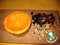 В тыкве вырезать серединку, чтоб получилось, как тарелочка. Сухофрукты и орехи измельчить. |