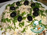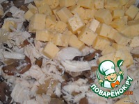 Куриное филе отварить(или говядину-с ней сытнее)порезать и смешать с грибами.Сыр порезать кубиками. При желании добавить порезанные маслины. Заправить майонезом. |