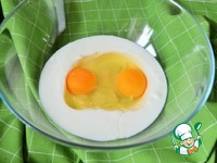 Духовку включить на разогрев. Тёплый кефир взбить венчиком с яйцами, солью и сахаром. |