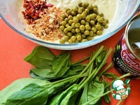 Добавить горошек, сушёные лук и перец, растительное масло. |