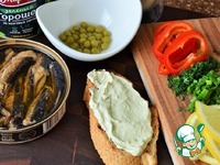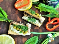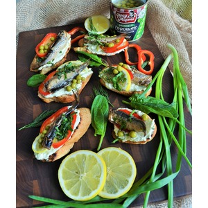 Положить по шпроте, украсить лимоном, колечком перца, зеленью и горошком. |