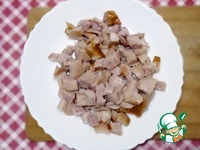 Снять мякоть с копченой курицы, нарезать кубиками среднего размера. |