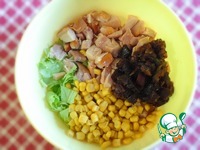 Соединить в миске кукурузу, финики, курицу, салат первой нарезки. Перемешать. |