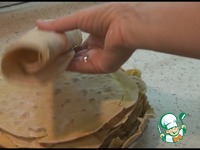 Описание: Тортилья - "маленькая тонкая лепешка" из кукурузной или пшеничной муки, очень популярная в Мексике, странах Центральной Америки и США. Тортилья является основой для многих блюд, где в лепешку заворачивают разную начинку. Кроме того, тортильяс часто подают вместо хлеба к другим блюдам. Они служат основой для пирогов, рулетов с начинкой, канапе и сендвичей. ИХ едят жареными или печёными, подают просто так или сворачивают и наполняют начинкой. Начинка может быть как соленая так и сладкая.