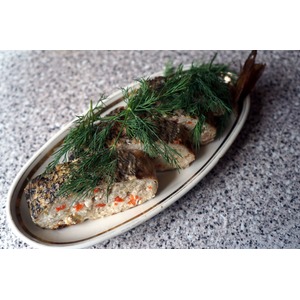 Описание: От традиционного еврейского блюда гефилте фиш эта щука принципиально отличается двумя чертами. Во-первых, рыба запекается в духовке, а не отваривается, как положено в еврейской традиции. Во-вторых – и это самое важное, - в фарше нет мацы или панировочных сухарей, зато в него добавлено свиное сало. Перечисленное, однако, не делает блюдо менее вкусным.