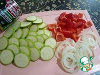 Лук очищаем и режем кольцами. Кабачки режем тонкими ломтиками, промываем и обсушиваем. Перец очищаем от семян и режем крупными кусочками. |