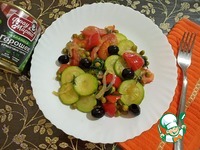 Выкладываем салат на подогретую тарелку, украшаем маслинами. |