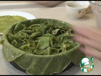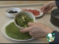 Сверху накрываем ещё одним блинчиком. Затягиваем пищевой пленкой и отправляем в холодильник минимум на 4 часа. |