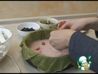 Треть мусса выливаем на дно формы. Сверху выкладываем 1/3 фруктов. |