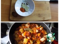 Из специй я добавлю в блюдо перец-кайен, душистый перец и лавровый лист. Всё перемешаю, посолю по вкусу и потушу ещё 5 минут. |