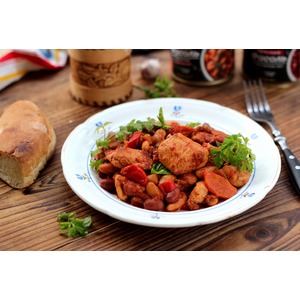 В конце приготовления добавить пассату (протертые томаты), специи, соль, белую и красную фасоль ТМ Фрау Марта. |