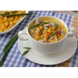 Курицу нарезать на кусочки и добавить в суп одновременно с сыром и кукурузой, хорошо размешайте и выключите огонь. |