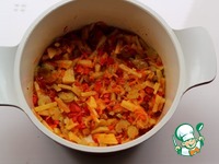 Обжаренные овощи залить горячим бульоном или водой и варить до готовности картофеля. |