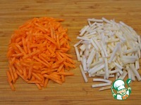 Морковь, корень петрушки (сельдерея) и лук нарезать тонкой соломкой. |